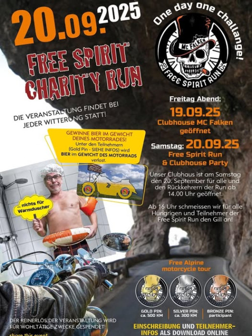 Die Teilnahmegebühr beträgt € 50.- und für den Beifahrer € 35.-. In der Teilnahmegebühr ist ein Free Spirit Rund Pin und T-Shirt inkludiert.